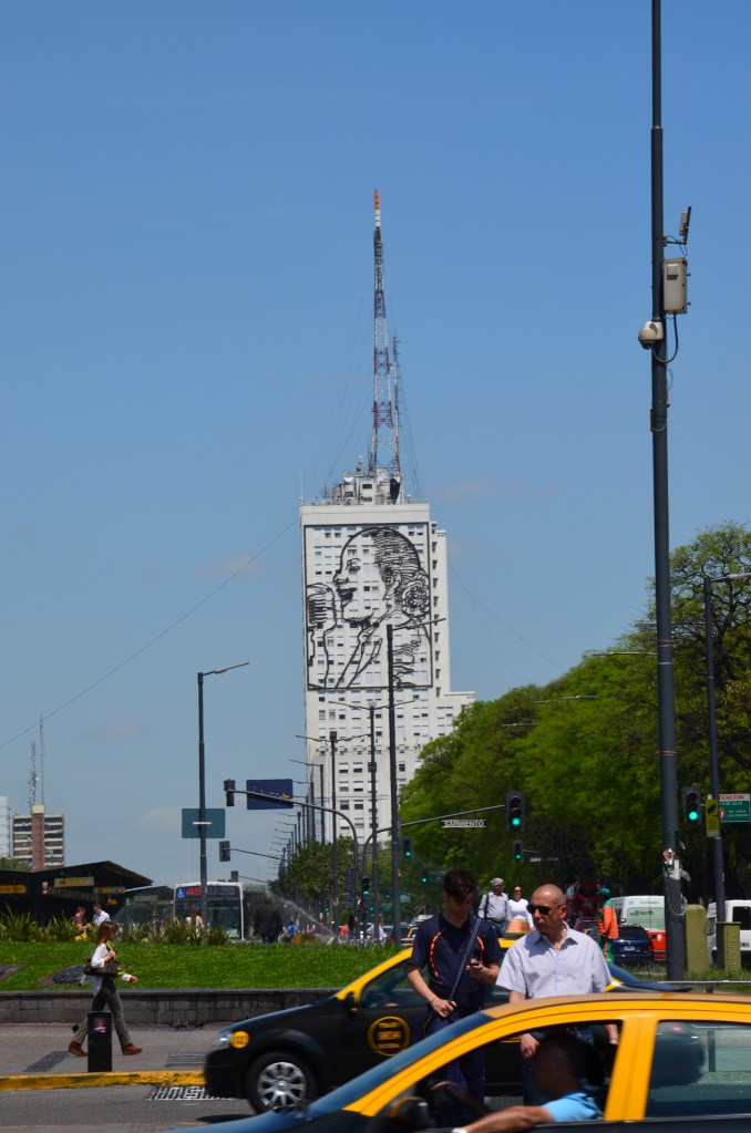 Evita czyli Eva Perón nadal jest symbolem Buenos Aires i nadal jest kochana przez ludność. Jeśli jej nie kojarzycie to Evita była dziewczyną, która wychowała się w będzie a wspięła na sam szczyt, była żoną prezydenta Argentyny, szarą eminencją i jedną z najpotężniejszych kobiet w historii tego kraju, to dzięki niej przyznano kobietom prawa wyborcze. Jej historia nadal inspiruje wielu artystów więc w całym mieście możemy odnaleźć sztukę jej poświęconą.. Jej wizerunek znajduje się na gmachu Ministerstwa Zdrowia. Z jednej strony widzimy ją spokojną i uśmiechniętą a z drugiej strony budynku emocjonalnie przemawiającą. Podobno spokojna strona przeznaczona jest dla mieszkańców natomiast na bardziej gniewna dla władz, które źle ją traktowały.