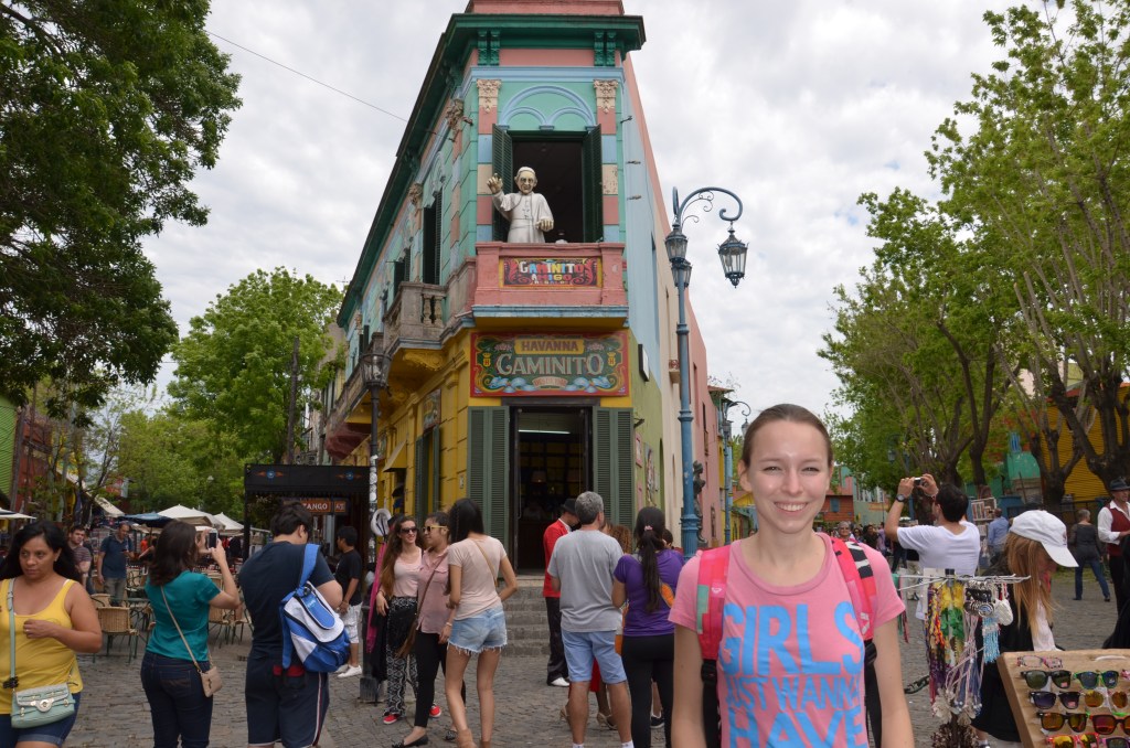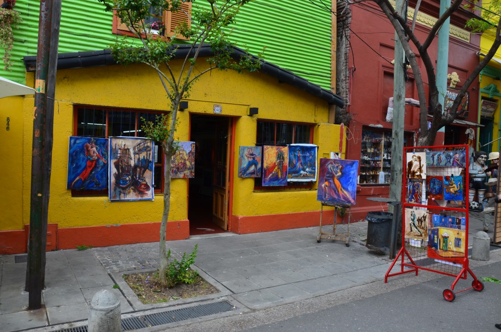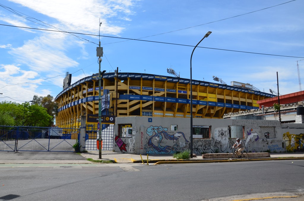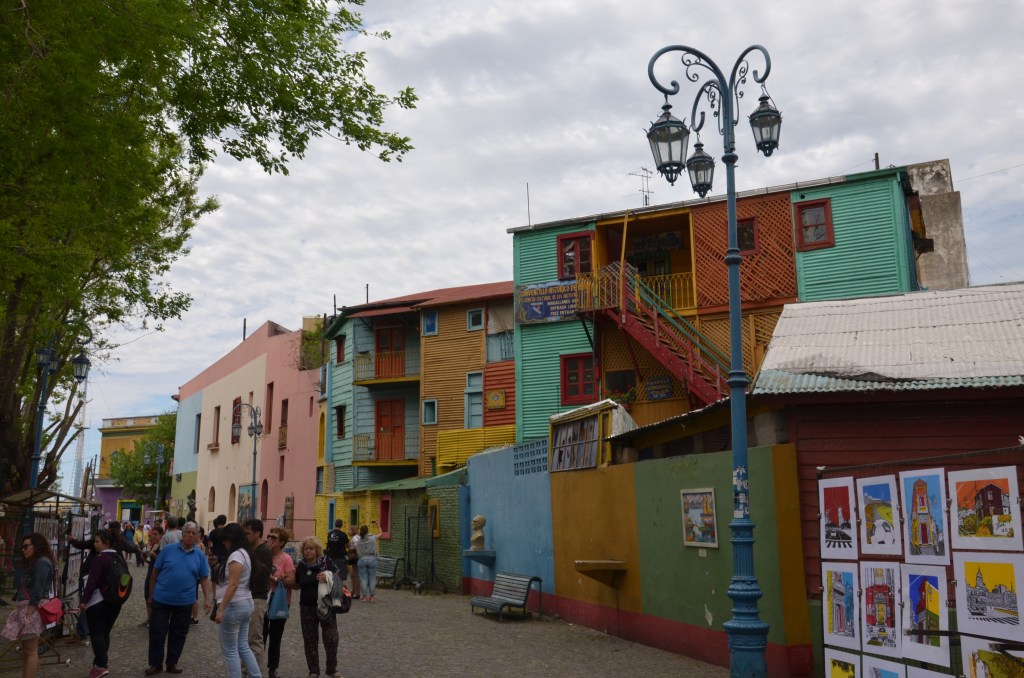 Bajecznie kolorową dzielnicę LA BOCA ze znaną ulicą Caminito. To dzielnica włoskich emigrantów z kolorowymi domami, kolorowymi balkonami, figurkami i obrazami. Niedaleko znajduje się słynny stadion piłkarski La Bombonera z niemniej słynną drużyną Boca Juniors. Ale uwaga okolice stadionu nie są bezpieczne. Zaczepiła nas tam policja gdy spacerowaliśmy i kazała schować aparat i łapać taksówkę do centrum.