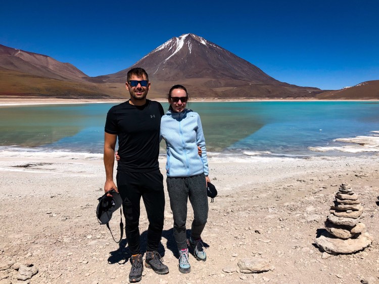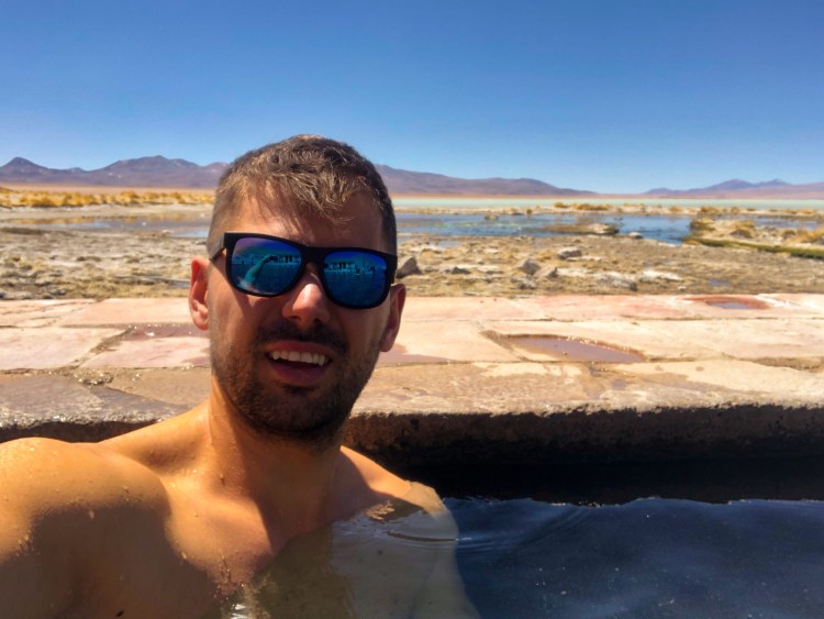 Następnie była trująca Laguna Verde – posiadająca w swoim składzie arszenik – oraz jezioro z gorącymi źródłami. Przemek ochoczo wykąpał się w jednym z nich :), ja zrezygnowałam z tej przyjemności bo mimo kuszącej temperatury 38 stopni w wodzie, wcześniej trzeba było przebiec kilkadziesiąt metrów po chłodzie.