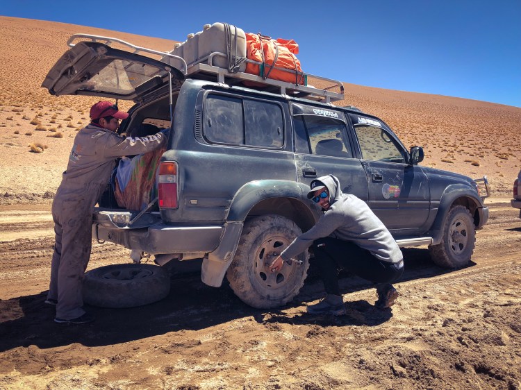 Oczywiście nie obyło się bez przygód – po drodze złapaliśmy gumę, na szczęście bohater dnia Przemek nas uratował (z „lekką” pomocą 2 kierowców). Całe szczęście bo ilość czarnych scenariuszy w mojej głowie, co może się z nami stać na tym pustkowiu zaskoczyła nawet mnie.