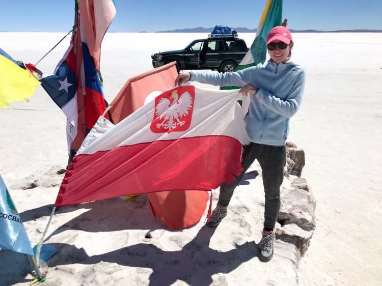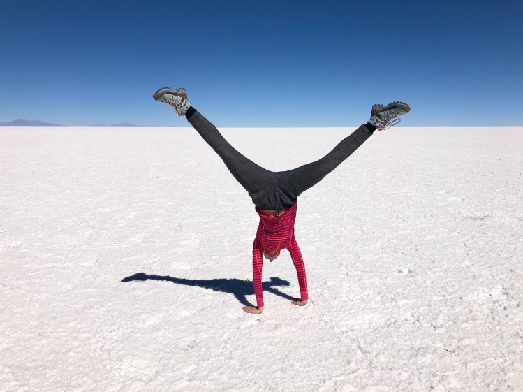 Dojeżdżamy na styk a musimy się jeszcze wspiąć na górę pełną kaktusów (wyspa Incahuasi – pozostałość po zalanym wulkanie). Biorąc pod uwagę, że na tych wysokościach męczę się po przejściu kilkuset metrów po płaskim, wspinaczkę pod górę przypłacam prawie wypluciem płuc. W połowie drogi głosem pełnym dramatyzmu – o ile to możliwe kiedy sapie się jak biegacz, który zdobył 100 piętrowy budynek – mówię Przemkowi aby mnie zostawił i poszedł zobaczyć i upamiętnić to piękne zjawisko. Po kilkunastu głębszych oddechach biorę się w garść i w ostatniej chwili dołączam do Przemka na szczycie. Widok jest przepiękny, zupełnie biała nieskończona przestrzeń sprawia wrażenie jak z innej planety.