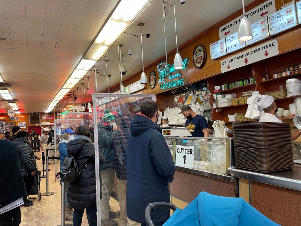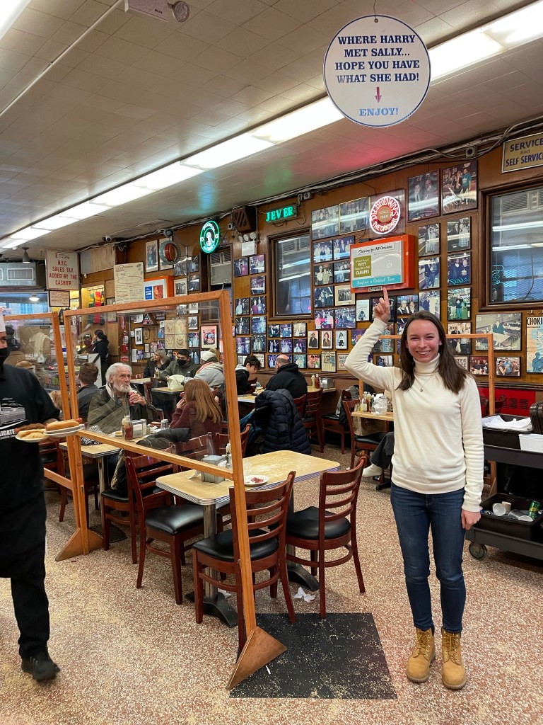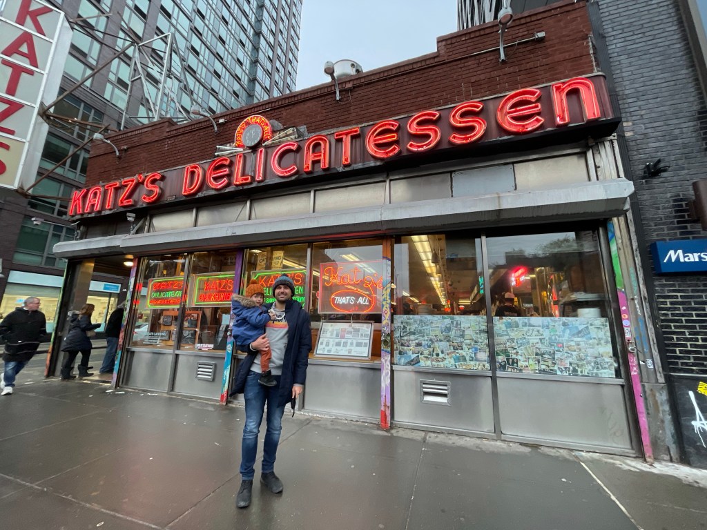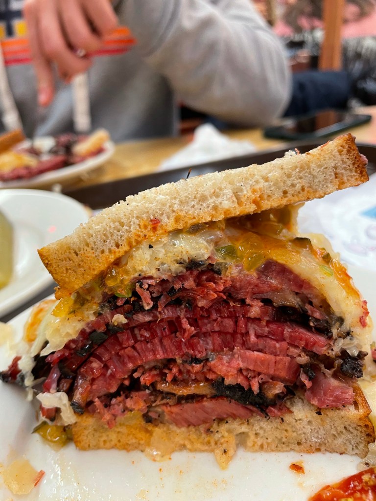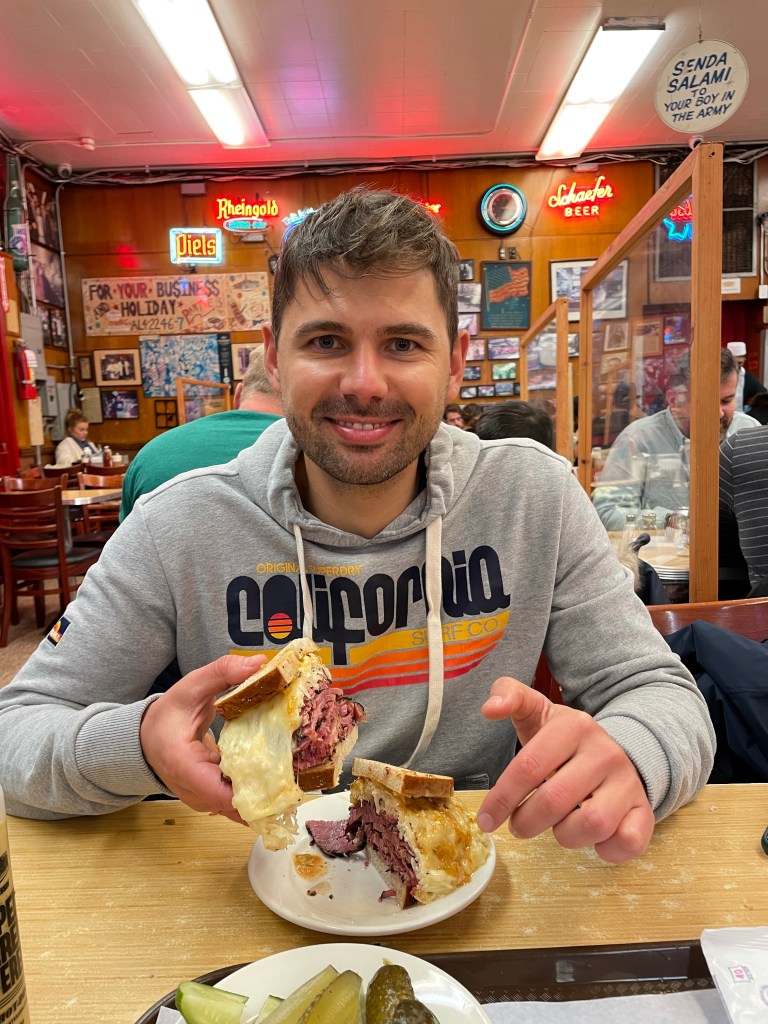 Jeśli chodzi o jedzonko to dzisiaj byliśmy w chyba najbardziej kultowej knajpie na Manhattanie. Mowa o Katz’s Delicatessen. Możecie ją kojarzyć z filmu „Kiedy Harry poznał Sally” słynna popisowa scena Meg Ryan i niezapomniany komentarz „I’ll have what she’s having”. W Katz’s Delicatessen zjecie klasyczną kanapkę z pastrami. My wybraliśmy wersję z pastrami, serem i kapustą kiszoną. Baaardzo to było dobre i klimat knajpy mega, podchodzisz do jednego z kilku stoisk przy, których stoją „cutterzy” a oni tną mięsko i wypychają kanapkę do granic możliwości. I uwaga jeśli będziecie, zamówcie najpierw jedną na 2 osoby. My z łakomstwa zamówiliśmy od razu 2 i nie podołaliśmy a wiadomo, że w moim brzuchu ciężko znaleźć dno..
