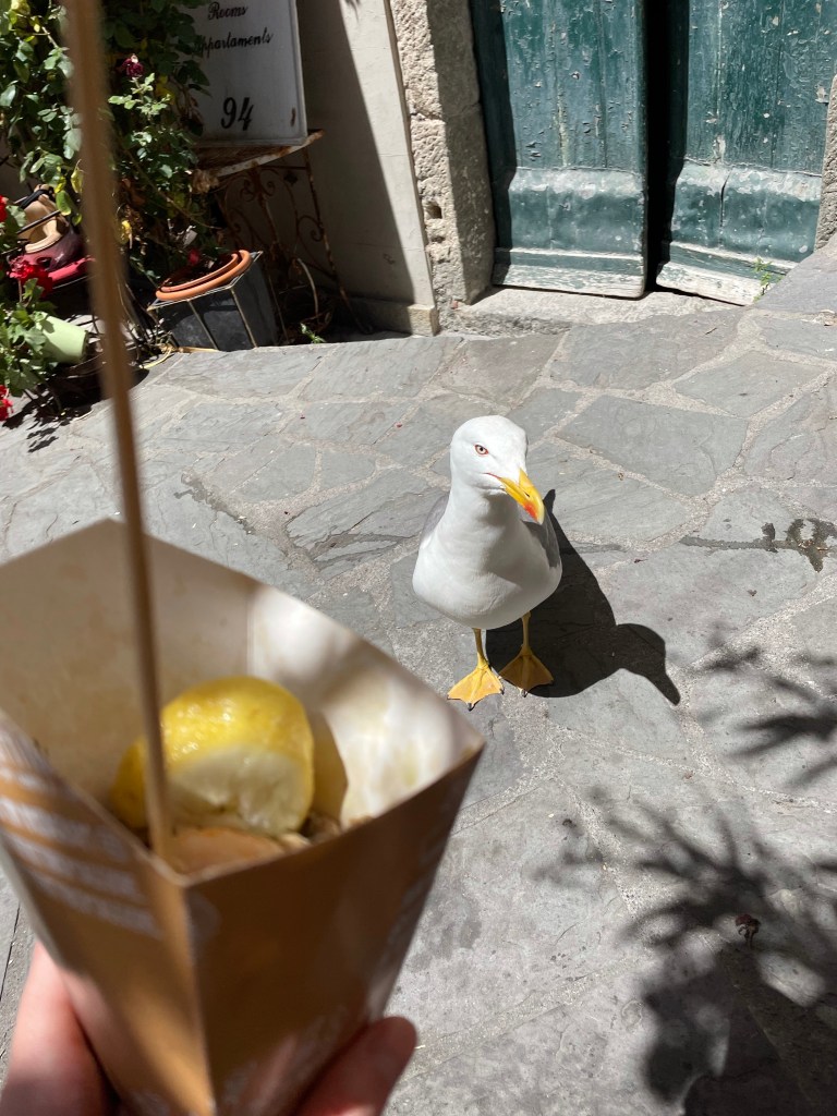 Samo miasteczko też jest urocze ale nic spektakularnego a ludzi sporo. Dzielnie wspinamy się na szczyt, a właściwie Przemek się dzielnie wspina pchając wózek a ja słyszę tylko jak mówi do Leona „wejdziemy na górę i poczekamy tam na mamę, nie martw się, kiedyś dotrze” 😂. Ale totalnie warto się wspiąć żeby zjeść pycha kanapkę z krewetami