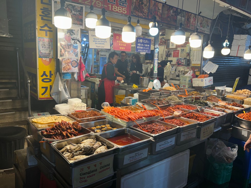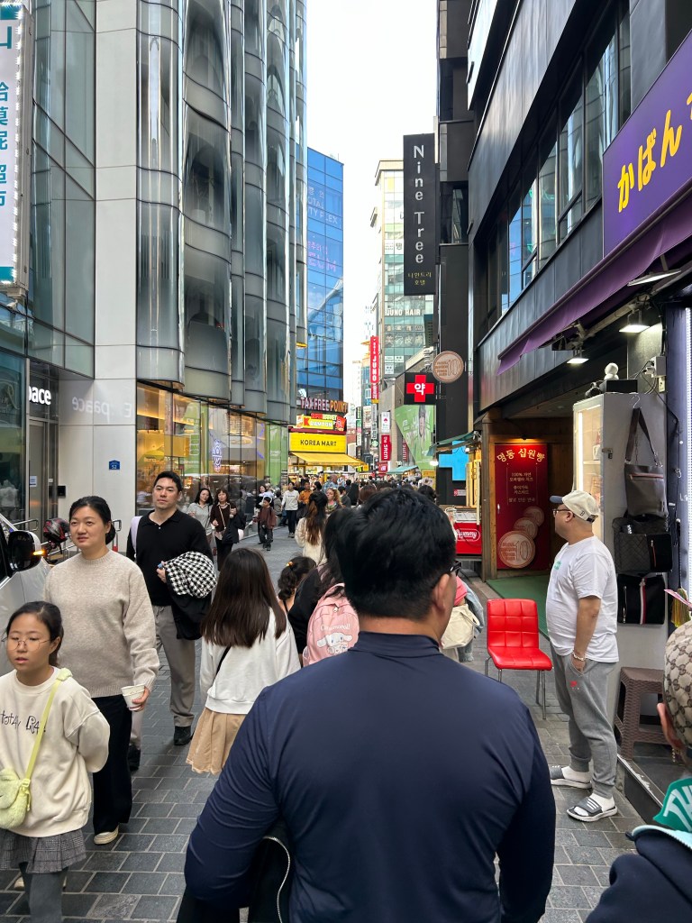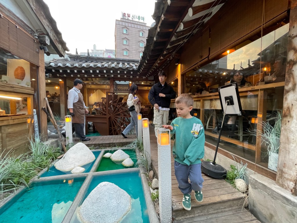 Najedzeni ruszyliśmy do następnej wioski hanok Ikseon-dong, ta wioska jest już zupełnie inna niż pierwsza, którą odwiedziliśmy, praktycznie cała przerobiona jest na odjechane knajpy i kawiarnie o oryginalnych wystrojach (tory w środku, fontanny i wiele wiele innych). Niestety byliśmy zbyt najedzenie po obiedzie żeby przysiąść, zresztą zmierzaliśmy do następnej jedzeniowej miejscówy targu Gwangjang Market. Streetfood tam wyglądał przeobłędnie ale zdaliśmy sobie sprawę, że realnie nie uda się nam tam usiąść z dzieciakami wśród milona ludzi i gorących kociołków, wzięliśmy przekąski na wynos i kolację zjedliśmy już w hotelu.