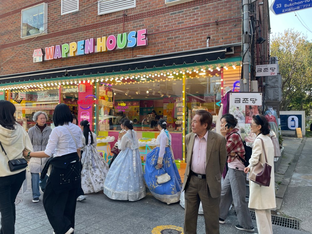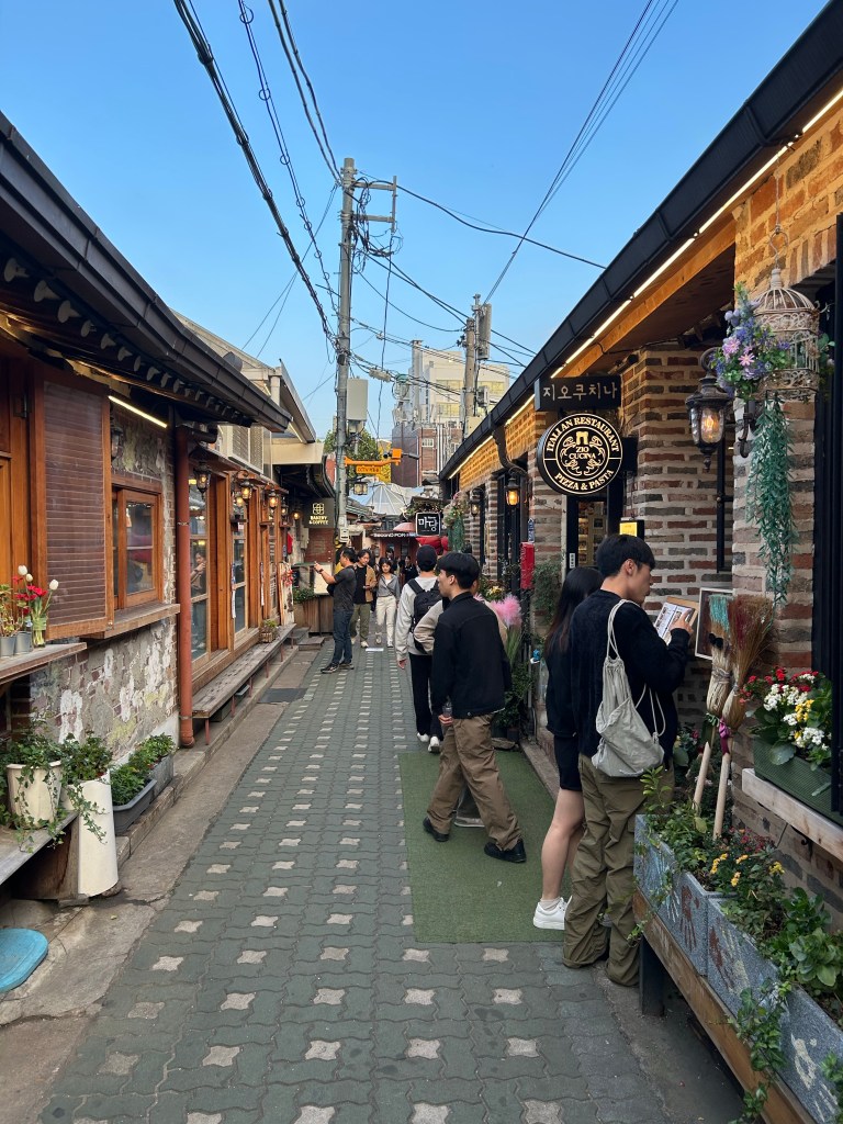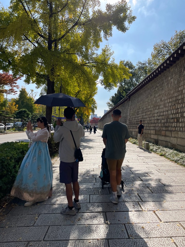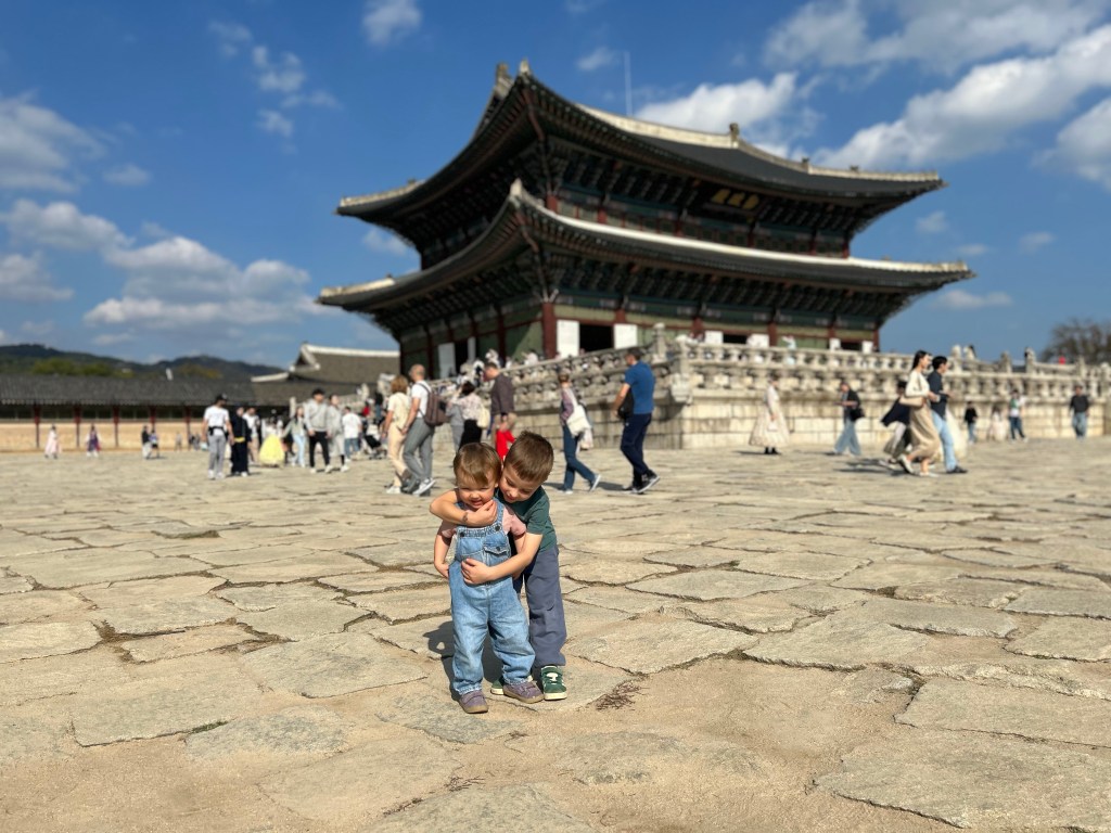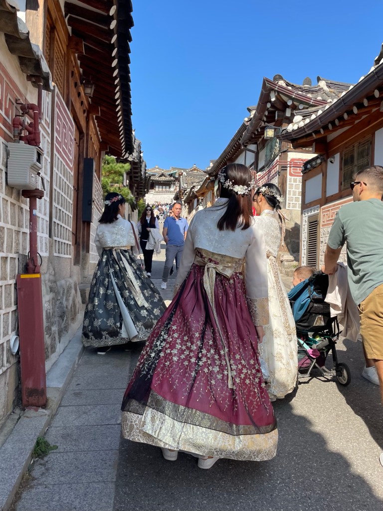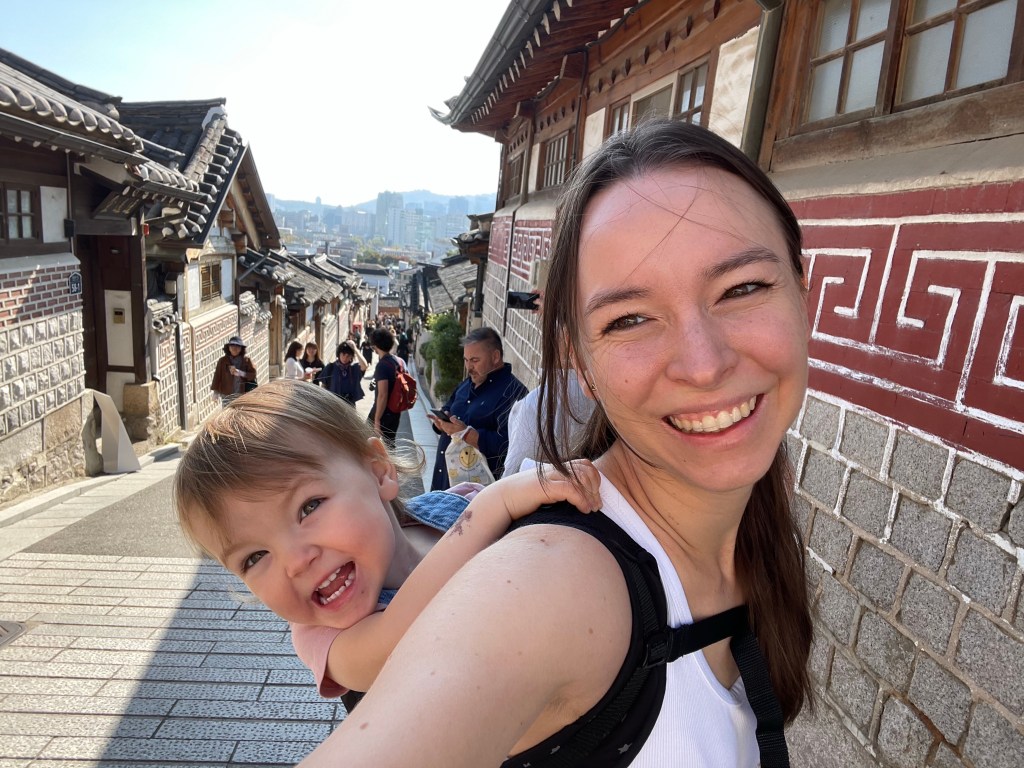 W takim trybie po zaśnięciu obudziliśmy się o 10, troszkę pokrzyżowało nam to plany ale szybko zwinęliśmy się na śniadanie i ruszyliśmy na podbój Seulu. Najpierw udaliśmy się do wioski Bukchon Hanok, słowo hanok oznacza właśnie te tradycyjne domki, które tworzą to miejsce. Powstały w czasach, kiedy tymi terenami rządziła dynastia Joseon, ostatnia dynastią władającą Koreą. W wiosce trzeba zachować ciszę bo nadal jest zamieszkała… No cóż Pani pilnująca ciszy podeszła do nas 2 razy a później już odpuściła. Matyldzie wyjątkowo dopisywał humor i trochę sobie śpiewała. 😂