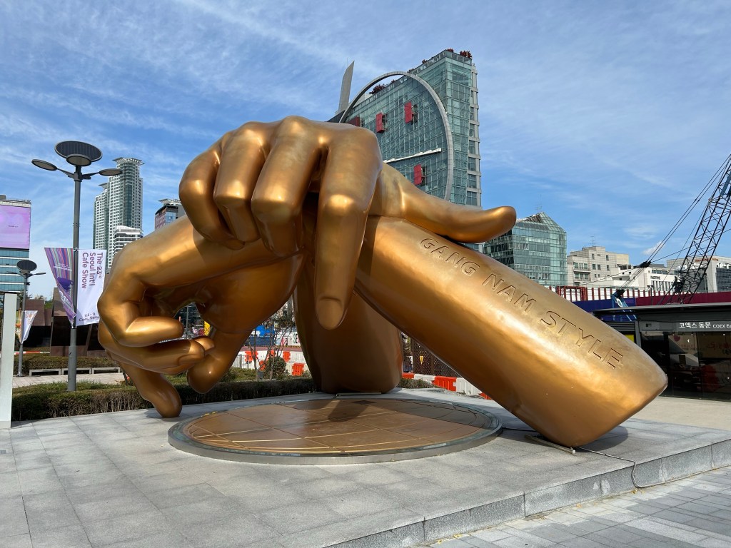 Potem ruszyliśmy do centrum handlowego Coex Mall w którym znajduje się imponująca biblioteka Starfield Library a przed nim można zobaczyć pomnik… Gangnam Style (centrum handlowe znajduje się w dzielnicy o nazwie Gangnam, więc ma to sens 👌). Tam zjedliśmy jeszcze pyszny ramenik i ruszyliśmy na spacer po okolicy. A potem spełniliśmy kulinarne pragnienie Przemka i wbiliśmy do knajpy „Korean BBQ” i nie ukrywam była to walka o życie 🙈. Cały urok tego dania polega, że na środku stołu jest palnik na węgiel i samemu albo z pomocą kelnera smażymy sobie mięsko. No ten gorący palnik z 2 maluchów to było wyzwanie, ale jedzonko przepyszne, więc bardzo polecamy ale raczej bez dzieci.