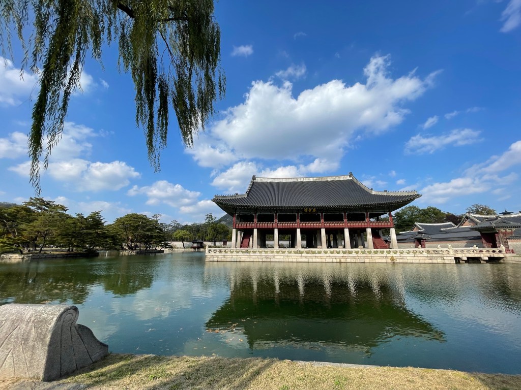 Następnie udaliśmy się do pałacu Gyeongbokgung. Pałac Gyeongbokgung to jeden z pięciu najważniejszych i największych pałaców w Korei Południowej zbudowanych przez dynastię Joseon. Jako jedyny udostępniony jest dla zwiedzających. Zbudowany w 1395, 2 razy był niszczony przez Japończyków drugi raz w 1915, odbudowa trwa do dnia dzisiejszego. Pałac zrobił na nas ogromne wrażenie podążaliśmy za oprowadzaną wycieczką i łapaliśmy jednym uchem ile się dało od przewodniczki, odpowiadając w międzyczasie na pytania czemu to wszystko jest drewniane, czemu nie karmimy ryb kamieniami, czemu nie można wejść do stawu i wiele innych ;). Na tyłach pałacu znajduję się klimatyczne ogrody królowej-cudne! Chcieliśmy trafić na zmianę warty, którą podobno super zobaczyć ale niestety sprawdzałam w przewodniku z nieaktualnymi danymi i byliśmy godzinę za późno.
