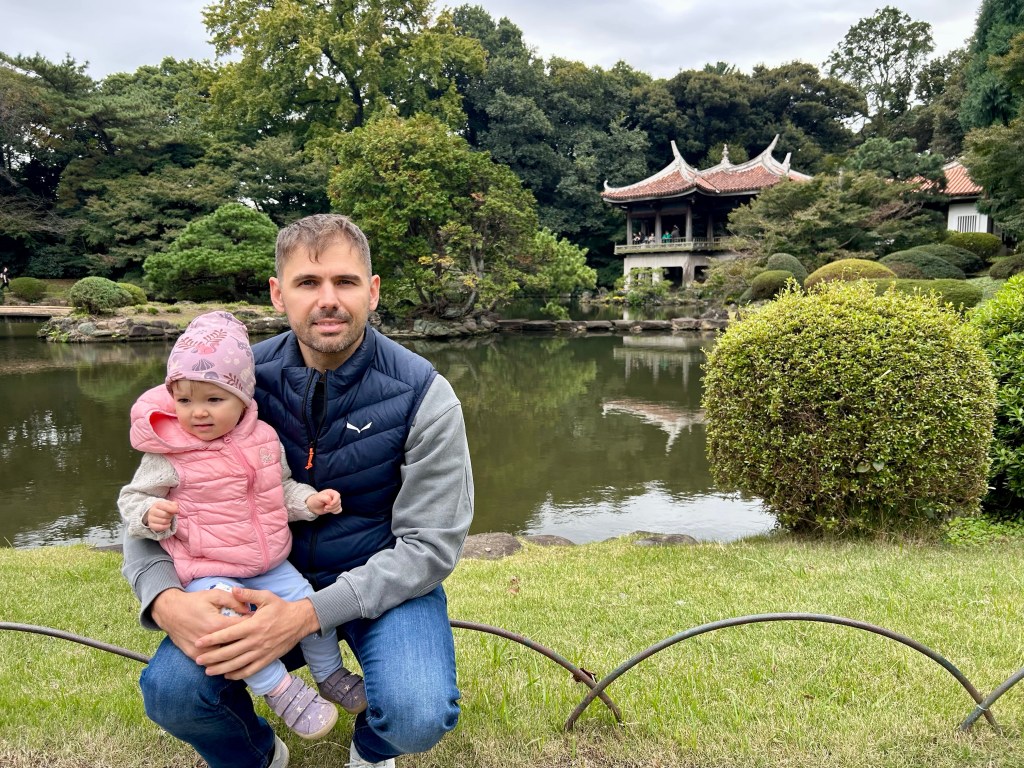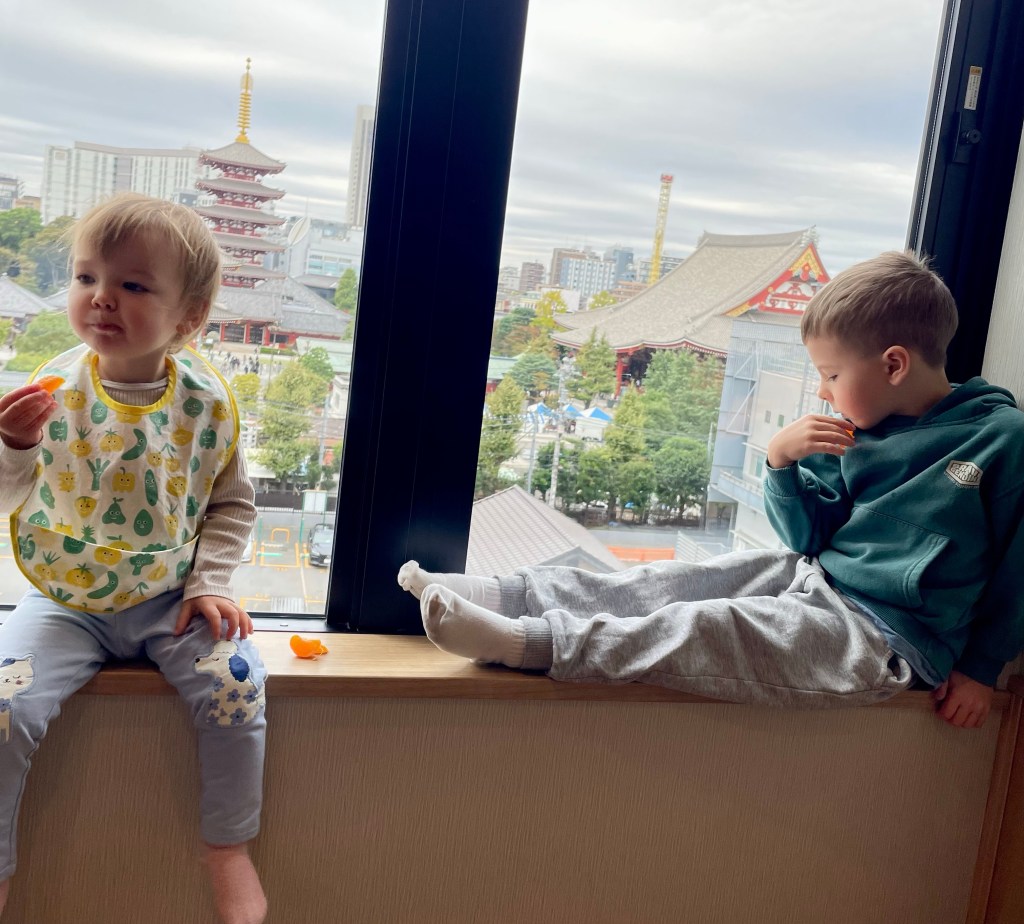Iii wylądowali, tym razem 2 godzinny poranny lot przebiegł bezawaryjnie (oprócz tego, że prawie się spóźniliśmy po zgubieniu się w metrze w Seulu ale dzięki temu czas na lotnisku minął nam dosłownie w kilka minut 😂). Niestety sporą obsuwę zaliczyliśmy już na lotnisku w Tokio. Najpierw olbrzymia kolejka do odprawy celnej, lecieliśmy Airbusem A380, Leon był tym faktem bardzo podekscytowany bo czytaliśmy o nim w jednej z jego książek, więc po wyjściu analizowaliśmy liczbę silników, pięter i ogólnie podziwialiśmy, więc 600 pasażerów było w kolejce przed nami 🤦♀️. A niestety dzieciaki w Japonii nie są tak miło traktowane jak w Korei (tam zawsze nas przepuszczano, pomagano, zagadywano dzieciaki – ogólnie przeserdecznie). W Japonii raczej mamy wrażenie, że dzieci są nie do końca mile widziane. Na razie z milszych interakcji mieliśmy potencjalnie 2. Jeden starszy Pan w restauracji, który siedział koło nas dał Leonowi i Matyldzie cukierki z kieszeni o wątpliwej jakości. Co do drugiej sytuacji głosy są podzielone czy była miła. W parku gdy bawiliśmy się z dzieciakami i turlały się z górki podszedł kolejny starszy Pan i zaczął nam coś tłumaczyć po japońsku, na nasz sygnał, że nie rozumiemy dodał gestykulację do swojej przemowy i ja zinterpretowałam to tak: „jak to miło widzieć takie śliczne dzieci bawiące się w naturze” Przemek uważa, że mówił: „jak tak dalej będą się turlać to wydłubią sobie oczy” także potencjalnie miła albo troskliwa interakcja. W każdym razie po odstaniu naszego czasu w kolejce z dwójką bardzo już znużonych dzieciaków i analizie wszystkich swoich decyzji życiowych, które doprowadziły do tego momentu, w końcu dostaliśmy się do odbioru bagażu po to tylko żeby odkryć, że nasza walizka jest połamana, więc trochę czasu zajęło jeszcze załatwienie sprawy z obsługą.