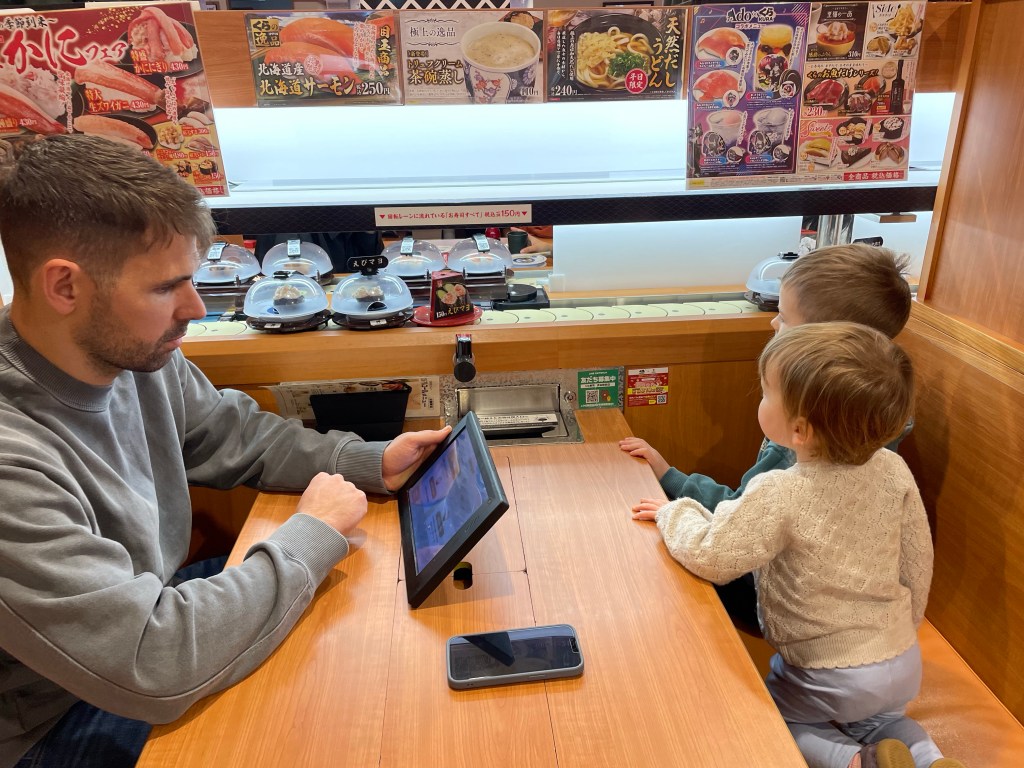 Ponieważ naszym życiem żądzą żołądki nie mogliśmy już dłużej odkładać następnej przyjemności czyli obiadu. Tym razem padło na knajpę z sushi na taśmie ale też innymi opcjami w menu tak żeby był większy wybór dla dzieci. To był kolejny strzał w 10, taśma zajęła dzieciaki na 1,5 h a my co chwila domawialiśmy jakieś inne nigiri, dzieciaki zjadły udon i krewetki w tempurze i dopchnęły kurczakiem, no cud miód.