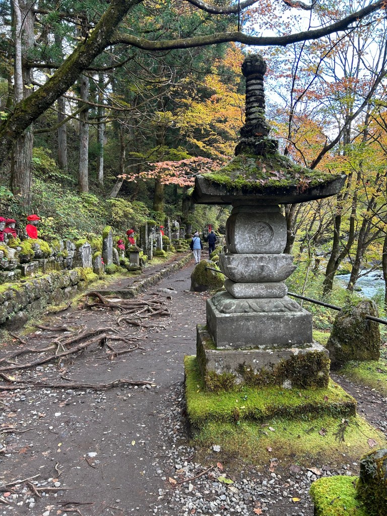 Pomimo dzieci przyjęto nas tu bardzo miło, tym bardziej głupio mi się zrobiło po powrocie do domu gdy zauważyłam, że moja mała kleptomanka zakosiła długopis i łyżeczkę stamtąd 🙈. W końcu najedzeni ruszyliśmy do ostatniego punktu dnia dzisiejszego, tajemniczego szlaku wzdłuż kanionu, gdzie postawione są posągi „Bake Jizo” opiekunów umarłych, te konkretne mają przydomek „Ghost Jizō” ze względu na legendę, która mówi, że potrafią pojawiać się i znikać i gdy je liczymy zawsze wychodzi nam inna liczba w okolicach 70. Oczywiście chciałam to sprawdzić ale przy łapaniu naszej dwójki komandosów skaczących po kamieniach i korzeniach i wytrącana ze skupienia abstrakcyjnymi uwagami doliczyłam do 40 i straciłam rachubę, więc nie udało mi się sprawdzić tej legendy. Co nie zmienia faktu, że ten spacer to była dzisiaj ulubiona część dnia. Do tej atrakcji dociera już mało turystów, więc przez większość czasu byliśmy tutaj sami wśród tych mitycznych stworzeń ❤️