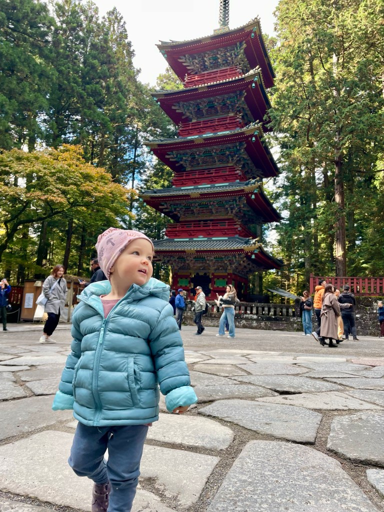 Dzień zaczynamy już o 5.30 aby o 6.30 ruszyć pociągiem do małego oddalonego o 2h jazdy górskiego miasteczka Nikko. Bardzo czekałam na to miejsce i spełniło oczekiwania w 100%. Przy planowaniu musiałam podjąć trudną decyzję i zrezygnować z jednej z głównych atrakcji Nikko jaką jest wodospad Keagon (jeśli będziecie podróżować bez dzieci to jest to absolutnie wykonalne. Niestety dla nas dołożenie 2h w autobusie do już 4 w pociągu było niewykonalne). Ale skupiając się na pozytywach i na tym co udało się nam zobaczyć. Po wyjściu z pociągu łapiemy jeszcze austobus żeby szybciej dotrzeć do pierwszego punktu programu czyli mostu Shinkyo. Doskonale znamy ten pocztówkowy widok ale na żywo robi niesamowite wrażenie, legenda głosi, że ksiądz który zabłądził w to miejsce zaczął się modlić i ukazał mu się Bóg Jinja-Daisho, który zesłał 2 węże na przeciwległe brzegi, węże złączyły się pośrodku i skamieniały tworząc most (drewniany).