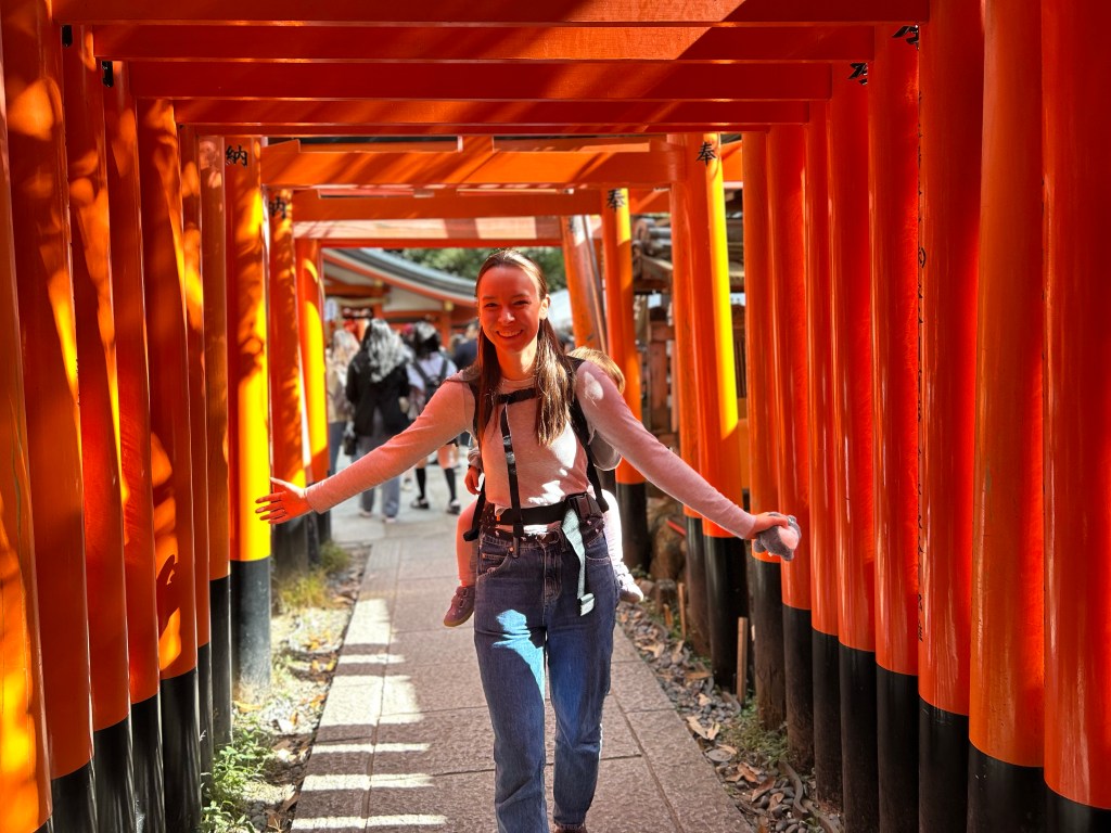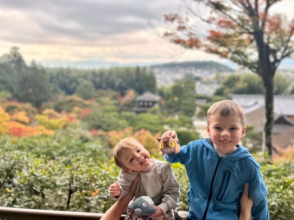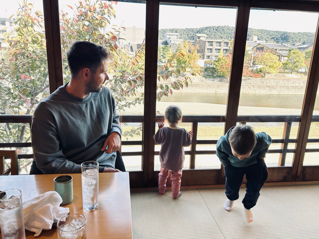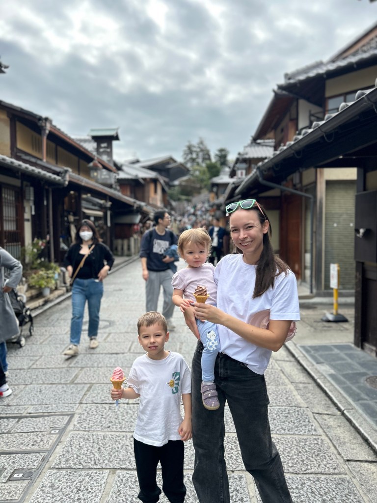 W Kioto spędziliśmy 4 dni. Nie udało nam się zobaczyć wszystkiego co zaplanowaliśmy ani tego co zobaczylibyśmy w 1 dzień bez dzieci😂, ale i tak wystarczyło żeby nas oczarować. Kioto to zupełnie inna bajka niż Tokio. Nie przeraża wielkością, nie ma tu biurowców i wieżowców, dotarcie z atrakcji do atrakcji nie zajmuje godziny . Jest za to niska zabudowa przesiąknięta historią, piękne góry dookoła, kanały i rzeki i mnóstwo świątyń (i podobno najwięcej gejsz w całej Japonii). Zwiedzamy tu spokojniej niż w Tokio, planując mniej rzeczy na dzień za to pozwalając sobie na wchodzenie do sklepików z pamiątkami, uroczych restauracji, świątyń i parków, które złapią nasze oko. Jeśli chodzi o dzieci to myślę, że ich największym rozczarowaniem tutaj jest nasz kategoryczny zakaz przeskoczenia przez linki i zabawy w tych wielkich śmiesznie pograbionych piaskownicach przy świątyniach. Kilka razy musieliśmy wynieść krzyczącą wniebogłosy i wyrywającą się Matyldę, której już prawie udało się dosięgnąć piasku (Leon za to się mnie spytał czy nie mam w plecaku łopatki, więc nie wiem jaki miał plan 😂).