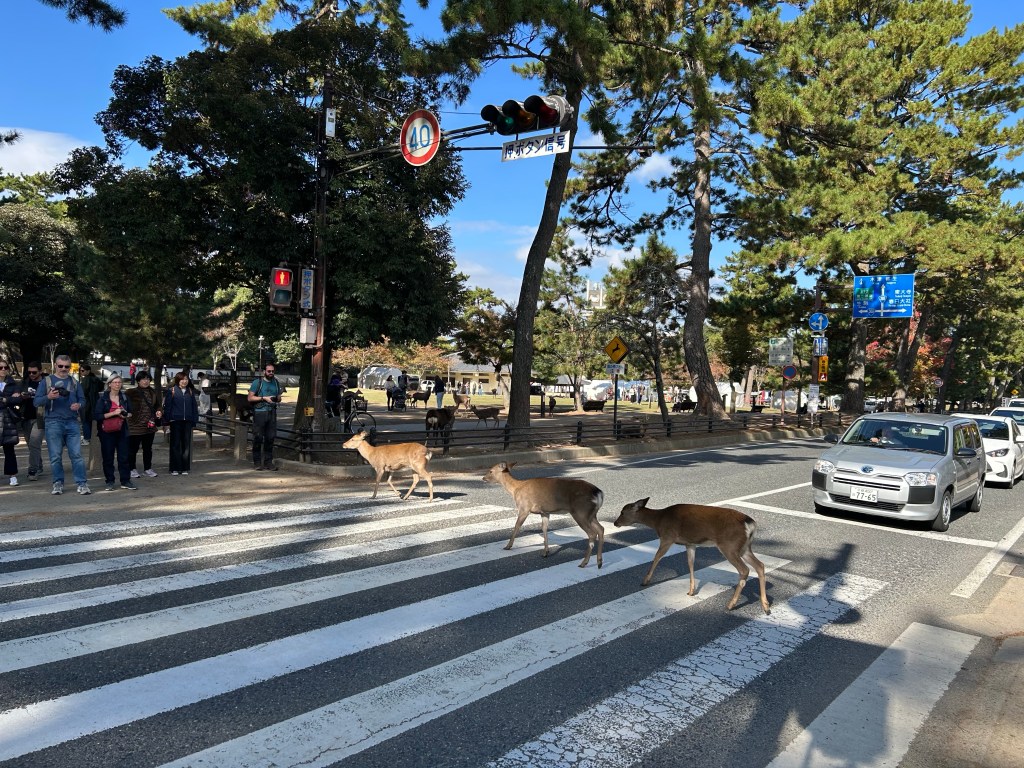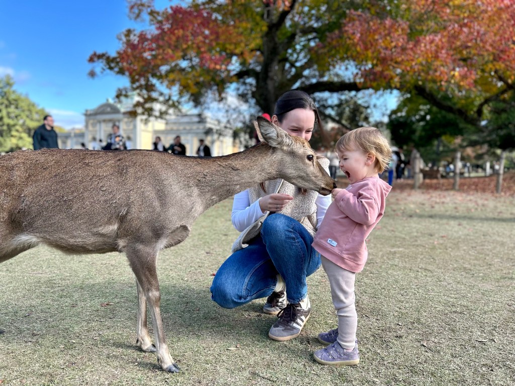 Dzisiejszy dzień to chyba najfajniejszy dla dzieciaków dzień z całego wyjazdu (a konkurencja jest spora, prawie tydzień w ciepełku na filipinach). Zaledwie 40 minut bezpośrednim pociągiem z Osaki (albo 60 minut z 2 przesiadkami jeśli komuś pomylą się pociągi), znajduje się pierwsza stolica Japonii (Kioto to druga a Tokio aktualna jakby ktoś się zastanawiał). Znajdują się tutaj bardzo duże, bardzo stare i bardzo ważne świątynie ale dla nas dzisiaj nie miało to większego znaczenia. Dzisiaj w Narze liczyło się jedno. JELONKI 😍. Wprawdzie w planie mieliśmy odwiedzenie tych starych, ważnych i zapewne pięknych miejsc ale dzieciaki miały tyle radości z karmienia jelonków, że nie mieliśmy serca odrywać ich od tego zajęcia i cały dzień spędziliśmy w parku spacerując, wygrzewając się w słoneczku i kłaniając się tym pięknym istotom. Pukniecie się w głowę, po co się kłaniać dziczyźnie? Otóż jelonki w Narze to eleganckie zwierzęta, które przejęły zwyczaj od swoich rodaków uprzejmego kłaniania się i gdy się im kłania odkłaniają się. Przynajmniej w teorii. W praktyce spacerując po parku masz wrażenie, że mógłby to być ogród w zakładzie psychiatrycznym gdzie wszyscy kłaniają się zwierzętom z różnym rezultatem. Czasami się odkłonią, czasami po prostu wykradną krakersa a czasami pogonią Cię dziwnym świstem 😂.