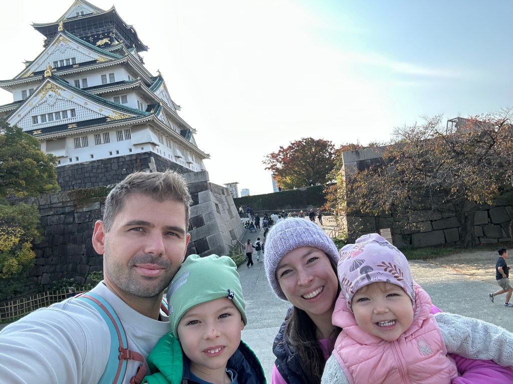 To już nasz ostatni punkt programu. Chodzimy po zatłoczonych ulicach pełnych restauracji z szalonymi dekoracjami na frontach. Odwiedzamy Zamek otoczony przepięknym parkiem i o dziwo placem zabaw. Znajdujemy jedzonka, których chcieliśmy spróbować a wcześniej nie było okazji a ostatniego dnia przed wylotem ku uciesze dzieci odwiedzamy tutejsze zoo. I to już tyle, pora do domu. Nawet się cieszmy, przeczołgał nas trochę ten wyjazd, było bardzo intensywnie. Przeszliśmy na nogach ponad 200 km (w 90% obciążeniem na plecach i/lub pchając wózek/walizkę). Zobaczyliśmy 7 miast, milion świątyń, dokarmiliśmy populacje filipińskich ryb i japońskich jelonków. Kilka razy zwątpiliśmy w nasze decyzje życiowe, które doprowadziły do tej podróży. Kilkaset razy zachwyciliśmy się pięknem świata. Zjedliśmy kilka kilo surowej ryby a Matylda wciągnęła kilometr udonu. Przekupiliśmy dzieci kilkunastoma paczkami czekoladowych pałeczek. Zachwyciłam się toaletami japońskimi i rozczarowałam brakiem koszy na śmieci w miastach. Bardzo pozytywnie zaskoczyli nas ludzie w Korei za to rozczarowali w Japonii. I to by było na tyle. Ostatni darmowy lot Matyldy zakończył nasz wyjazd. Dziękuję wszystkim, którzy czytali o naszych przygodach ❤️