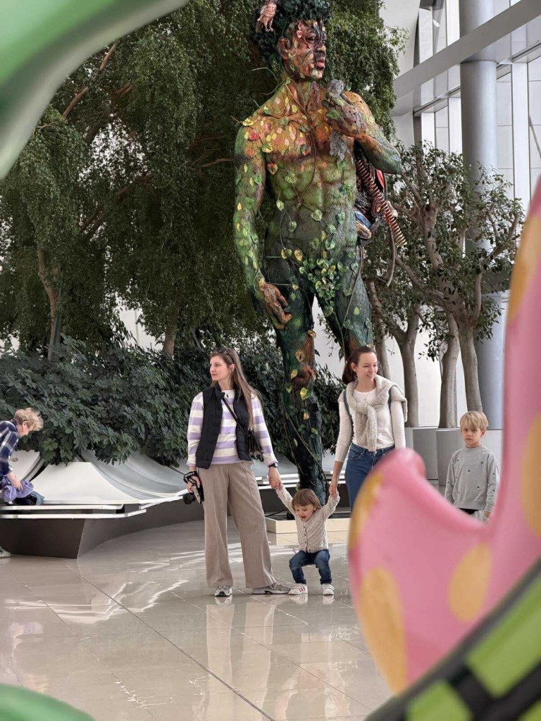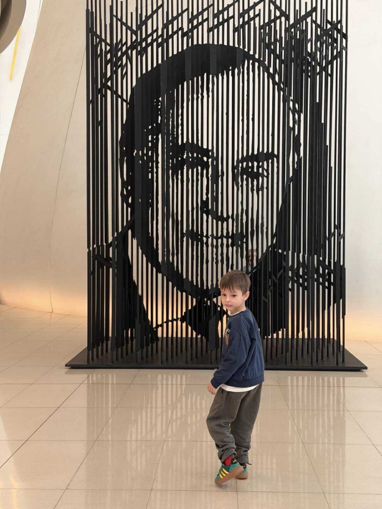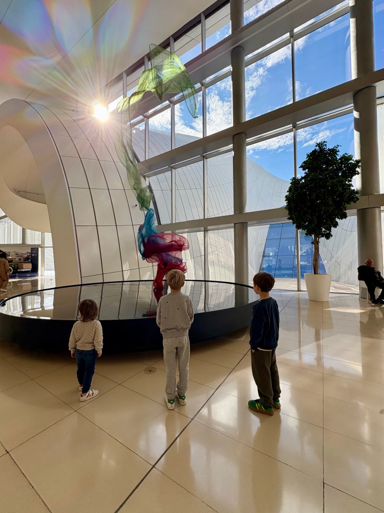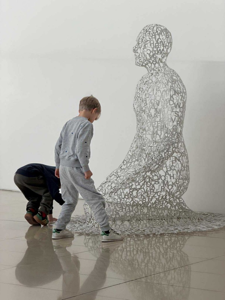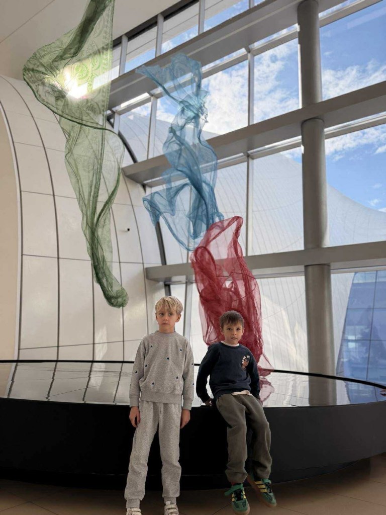 Na wejściu wita nas niesamowita instalacja z lewitującymi szalami. Dzieciaki są zahipnotyzowane, a ja sama też nie mogę oderwać wzroku. Dalej poznajemy inne nowoczesne konstrukcje, rzeźby, lalki, a nawet — tak właśnie! — nasze ulubione dywany.