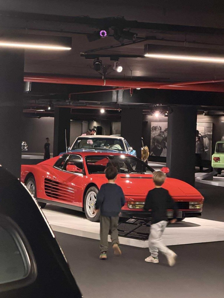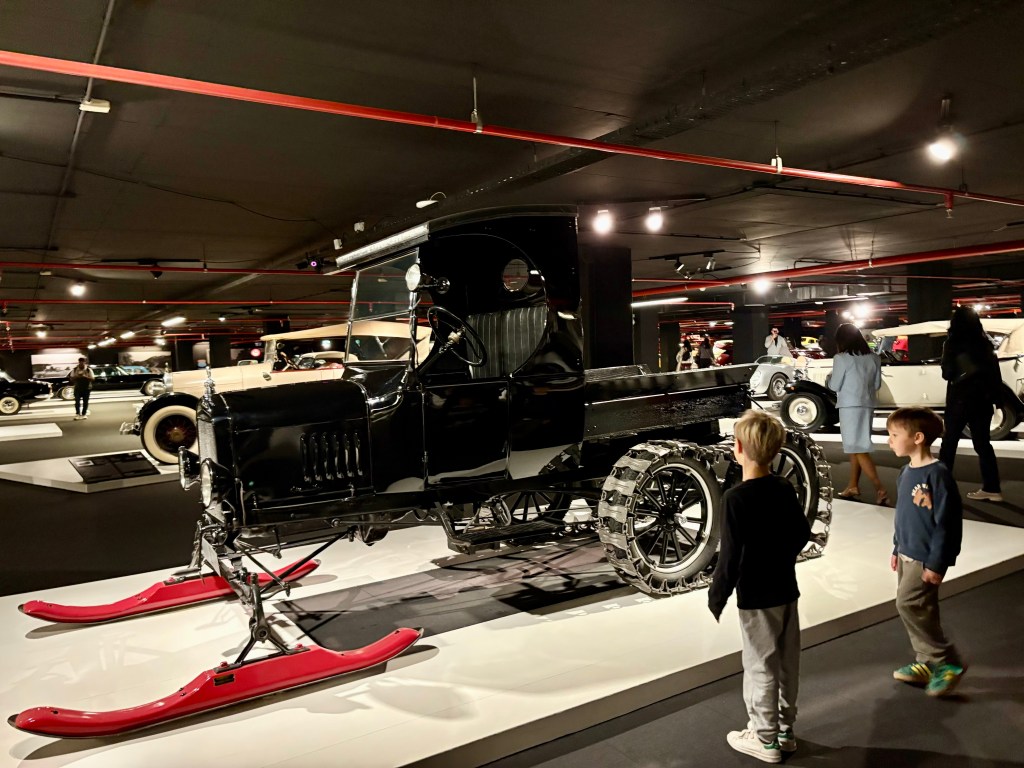 A potem wisienka na torcie: muzeum samochodów, osobna wystawa znajdująca się pod główną częścią centrum. Dzieciaki zachwycone — oglądamy tu wszystko: od karoc i szalonych pojazdów śnieżnych po wypasione Cadillaki i Ferrari.